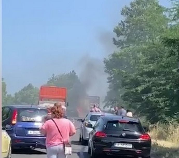 Камион и кола пламнаха при катастрофа на пътя Бургас-Созопол, непосредствено след кв. Крайморие. Двете превозни средства са катастрофирали, като леката кола е била с метанова уредба. От удара възникнало запалване, което обхванало и двете превозни средства.
