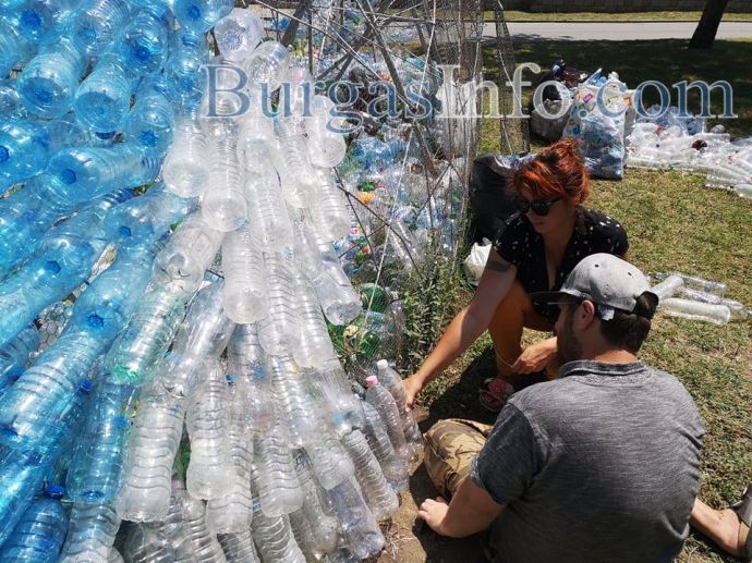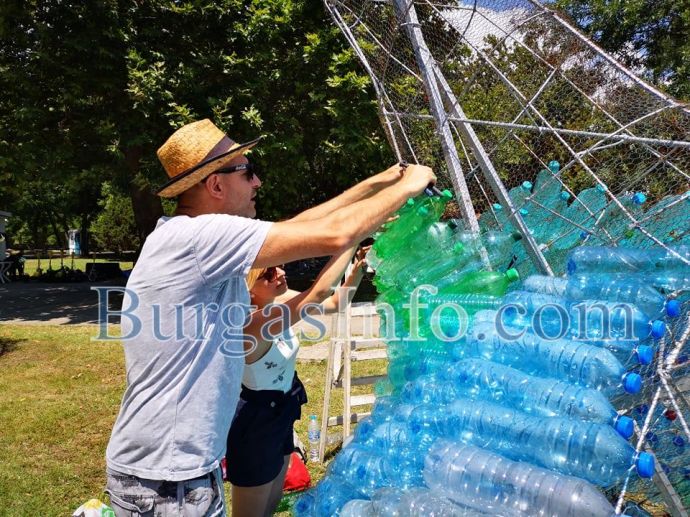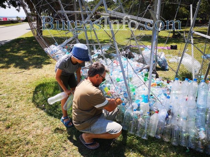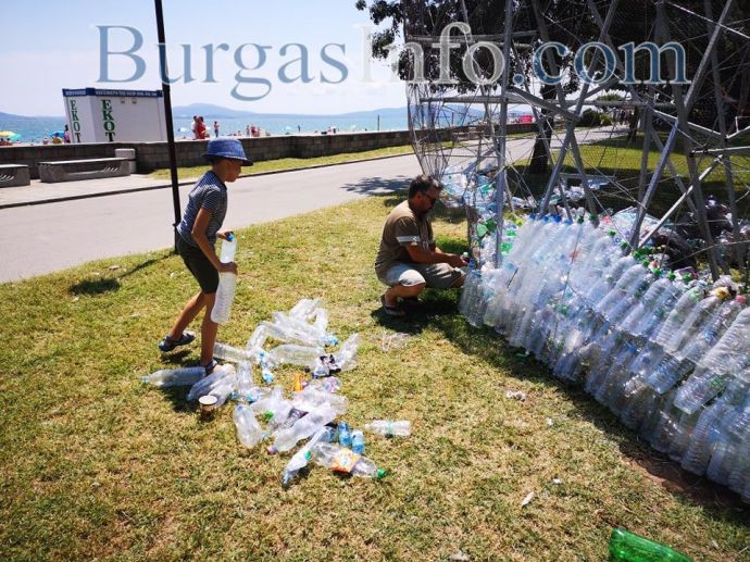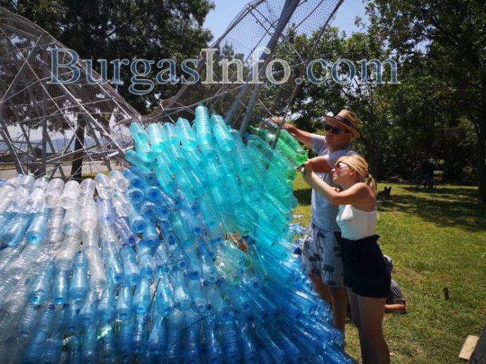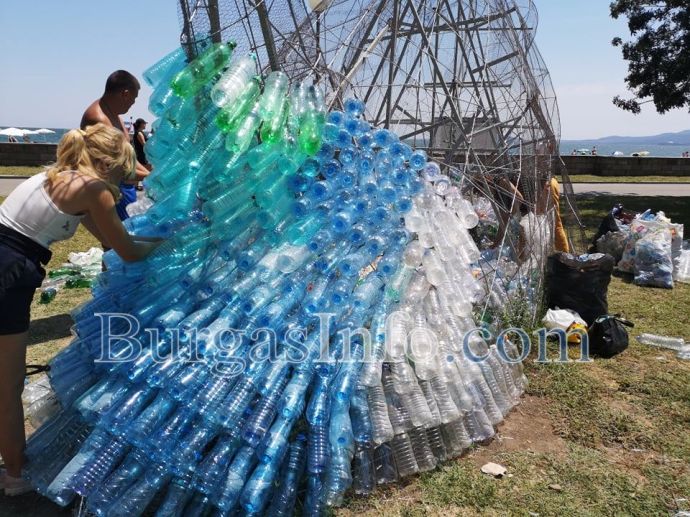 Гигантската риба Марина от днес започва да блести с люспи от пластмаса до крайбрежната алея в Морската градина в Бургас. Върху металната конструкция, която се издига там, ентусиасти подреждат една по една пластмасови бутилки, събирани около месец и половина.