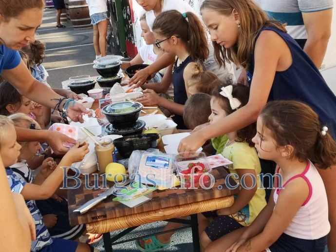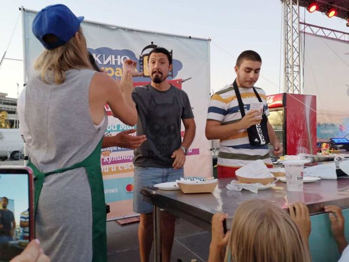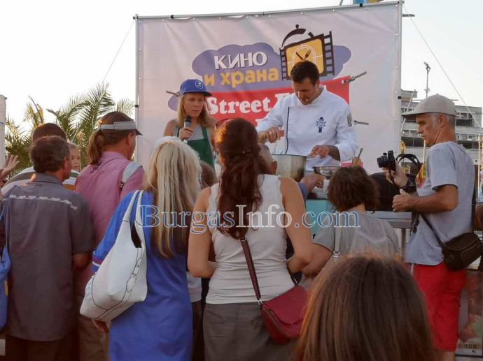 Атрактивен Street food старт събра любители на кулинарията в Бургас, които наблюдаваха с интерес демонстрациите на мастършефовете Станислав Райчев, Карина Попова и Десислава Кирова от „Тортичка“. Те бяха част от първия ден на Street food & Art Festival "Кино и храна", който започна вчера следобед край Морска гара и ще продължи до неделя. Райчев е любимият мастършеф на Бургас, тъй като той е от морския град и е пожарникар по професия. Той представи как се приготвя хрупкава риба със сос Тартар, намачкан грах и картофен чипс. Събралата се публика с любопитство научи, че панираната с оризово брашно риба се поставя в мазнинаната бавно, за да не потъне и че при изваждането й температурата вътре трябва да е 72 градуса. Това гарантира хрупкава коричка и сготвена риба.