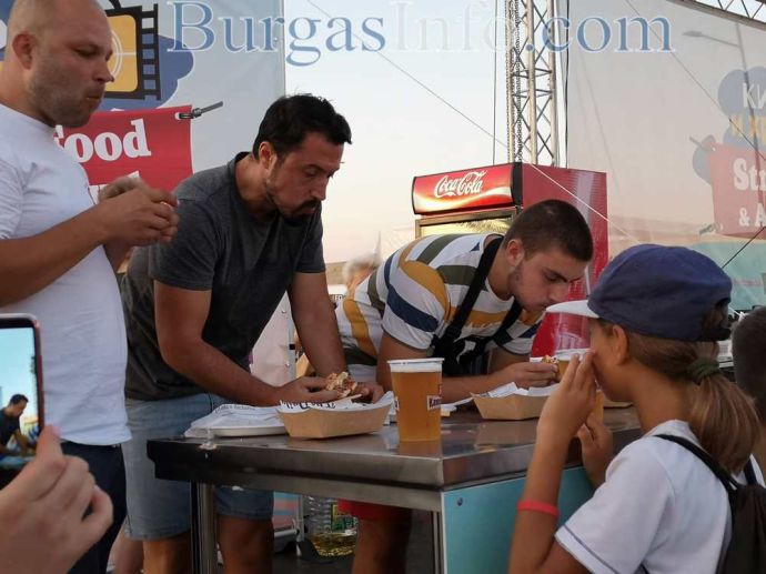 Хората с усмивки и много емоции подкрепяха тримата смелчаци, които взеха участие в Street food многой. Драго, Александър и Виктор трябваше да изядат определено количество „улична храна“ възможно най-бързо. Те с ентусиазъм започнаха да поглъщат предоставените им бургер, наденичка и бира. Въпреки, че през цялото време Виктор беше с лека преднина, победител с последните хапки и глътки стана Александър. „Добре сме и е вкусно“, казаха и тримата участници след финала.