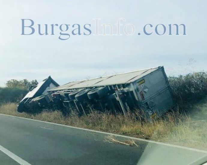 Тир се обърна на пътя от квартал Ветрен към Бургас, съощиха шофьори пред БургасИНФО. Инцидентът е станал в района преди бензиностанция „Rom petrol”. Участъкът е обезопасен с конуси на пътя, на място има екипи на полицията.