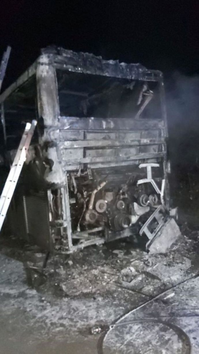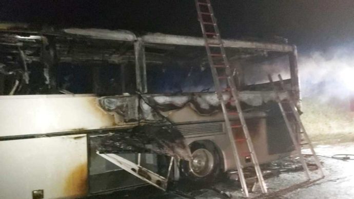 Автобусът е изгорял почти изцяло. Пътниците са на различна възраст, има и човек с увреждане.