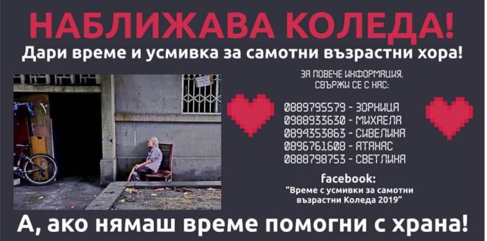 Коледа наближава и градът придобива приказен облик. За много възрастни хора в Бургас обаче празниците не носят семейна магия, в домовете им няма кой да влезе, няма какво да сложат на масите си на Бъдни вечер. Те са сами през цялата година. Затова в навечерието на най-светлия празник група млади хора организира инициативата “Време с усмивки за самотни възрастни Коледа 2019”.