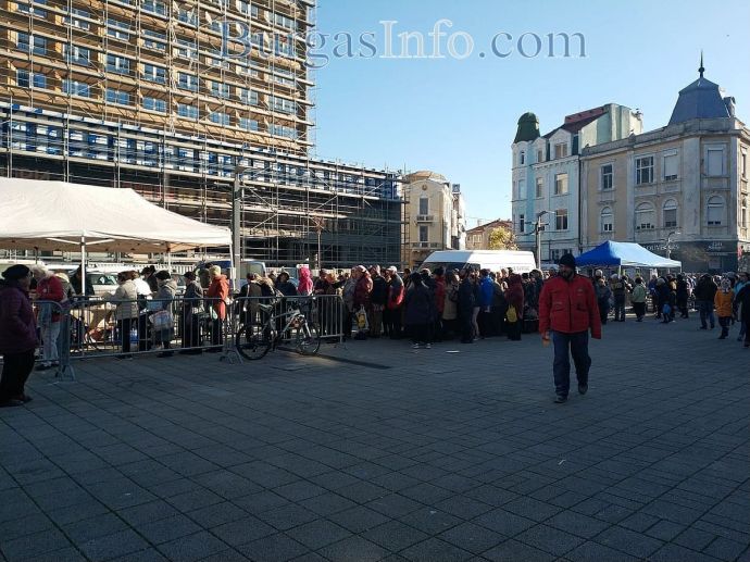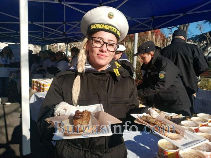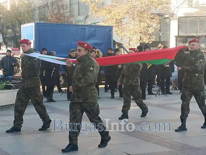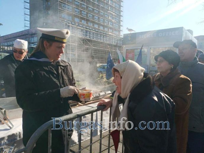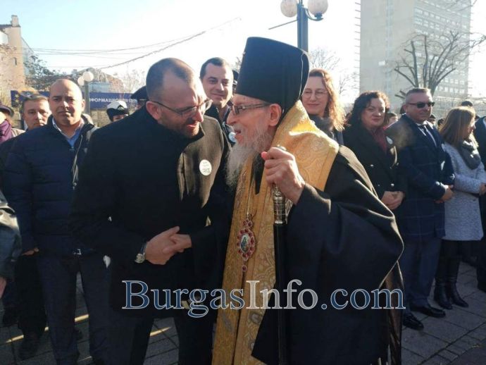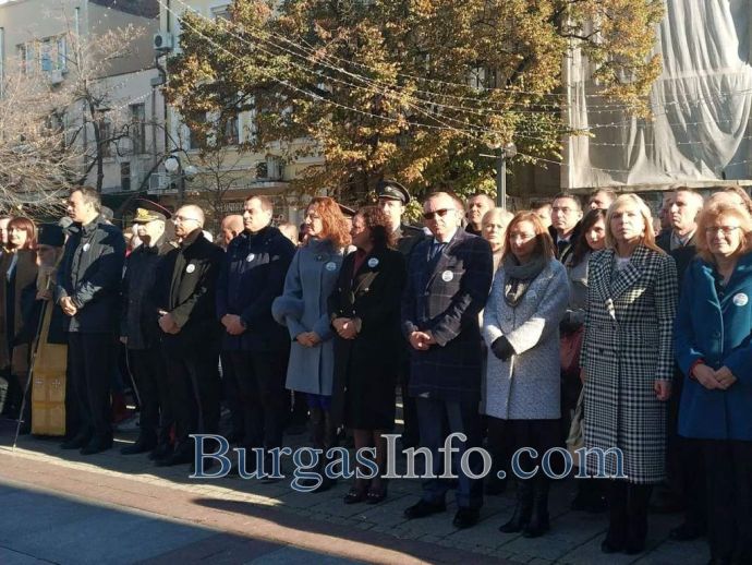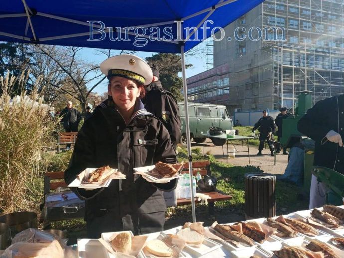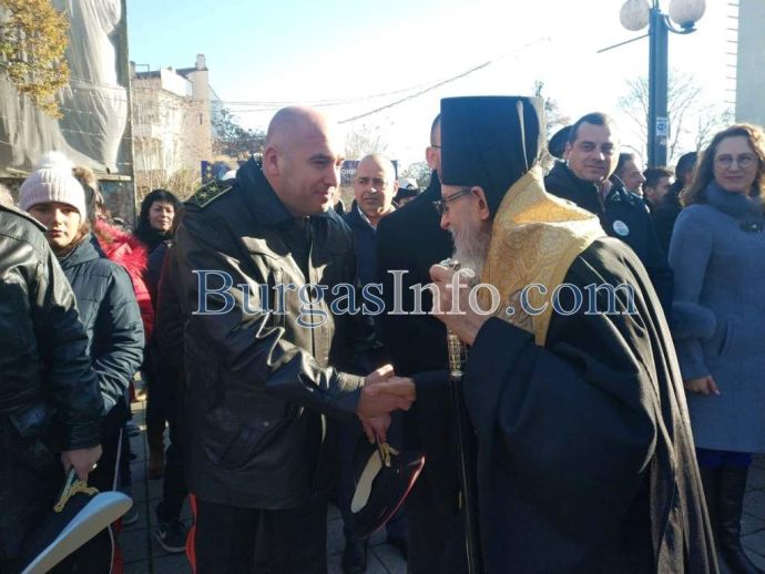 Малко по-рано на площада пред Община Бургас не церемонията по изидгане на националния, еврипейския и общинския флаг. След това официалните лица – кметът Николов, областният управител Вълчо Чолаков, общински съветници присъстваха на освещаването на трапезата в градинката до Часовника.