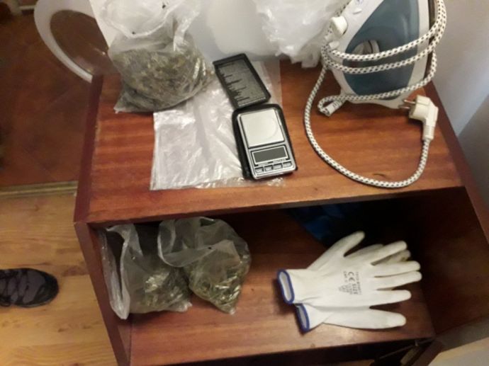 Извършено е претърсване и в частен дом в същия блок, обитаван от 42- годишен помориец. Открити и иззети са осем чували със суха тревна маса и четири найлонови плика със съцветия - глави/ марихуана. Иззети са още ел. везна и центрофуга.