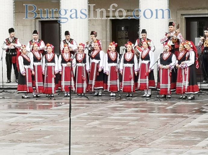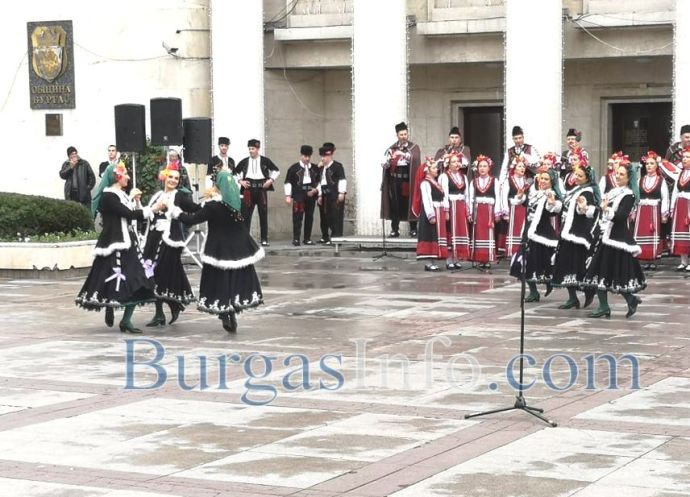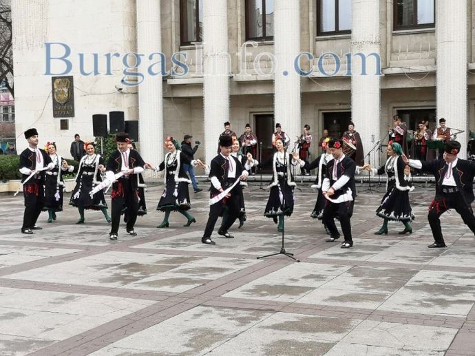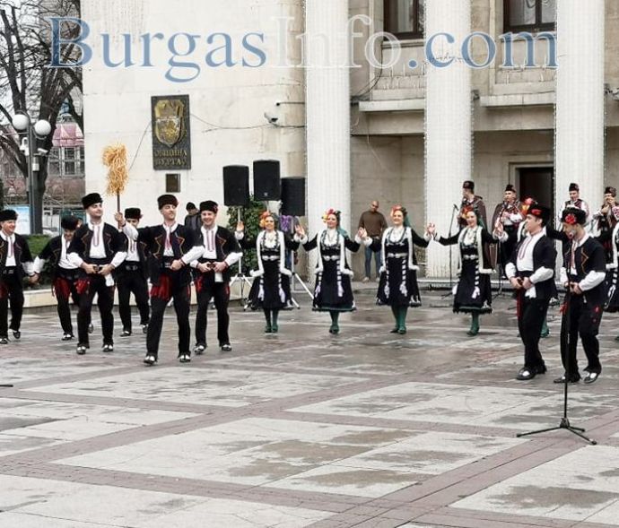Коледари и сурвакараи разтърсиха площад „Атанас Сиреков“ пред сградата на Общината, където се състоя големия фолклорен концерт на професионалните музиканти и танцьори от ансамбъл "Странджа" с художествен ръководител Марио Егов. Концертът беше част от празничната програма на Община Бургас и събра публика от всички възрасти. Цели семейства се забавляваха заедно.