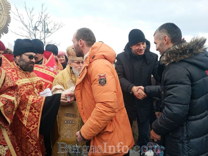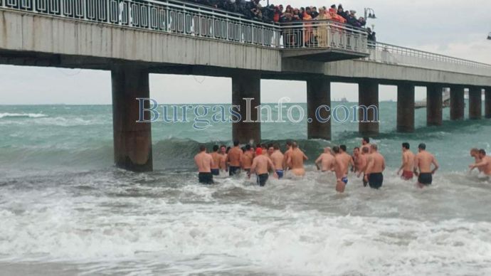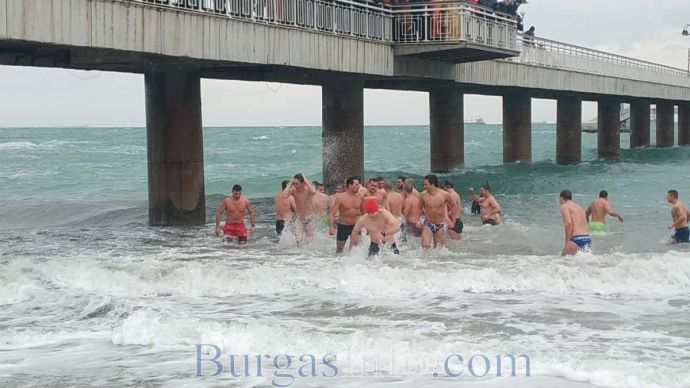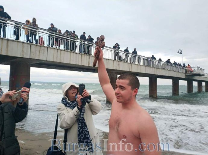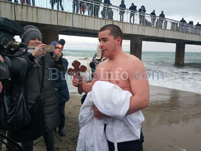 Ниските температури не спряха 30 смелчаци да влязат в морето навръх Богоявление. Тази година, заради лошото време, се наложи вместо от Моста както обикновено, те да се хвърлят във водата от брега. Кръстът бе изкаран от 22-годишния бургазлия Яким Георгиев. Младежът е студент в Англия.