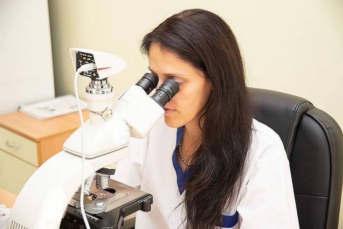 Онкопатологът д-р Ярослава Маринчева изследва под микроскоп пробите от цитонамазките