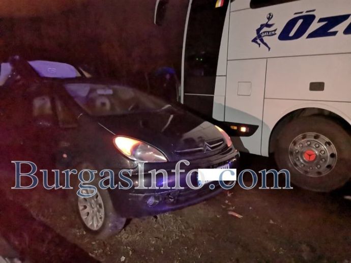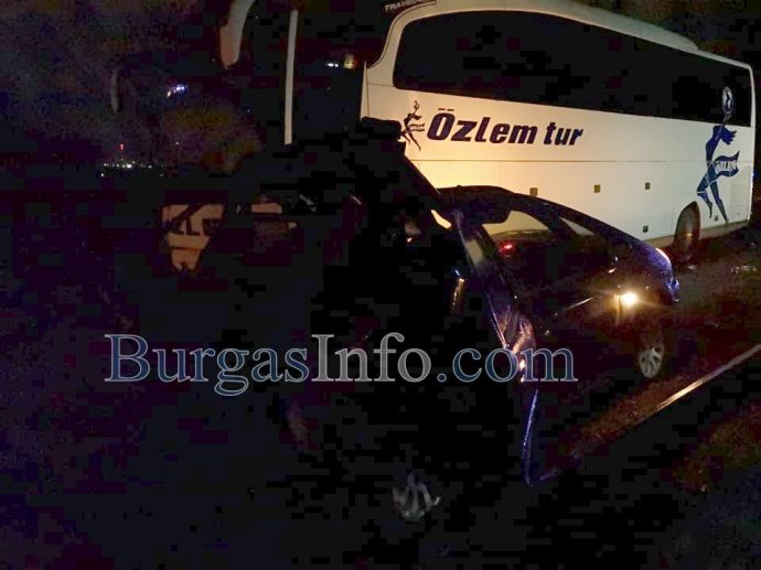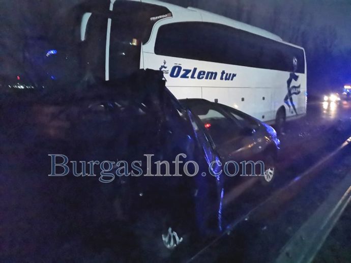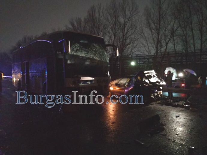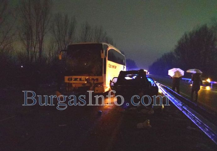 Труповете на загиналите при тежката катастрофа на изхода на Бургас към Созопол все още са край мантинелата между двете платна. Край тях е жестоко ударен лек автомобил „Ситроен” с бургаска регистрация, който е обърнат в обратната посока на движение, до него е турският автобус, който е пътувал към Малко Търново. Няколко метра по-назад има ударен лек автомобил „Фолксваген”, който е с нанесени леки щети в предната част, докато на Ситроена цялата задница е буквално отнесена. Пътят Бургас-Созопол, в този участът - от детелината от Бургас до бензиностанция „Лукойл”, е затворен и в двете посоки. На място са екипи на полицията, които пренасочват движението още от пътен възел Юг.