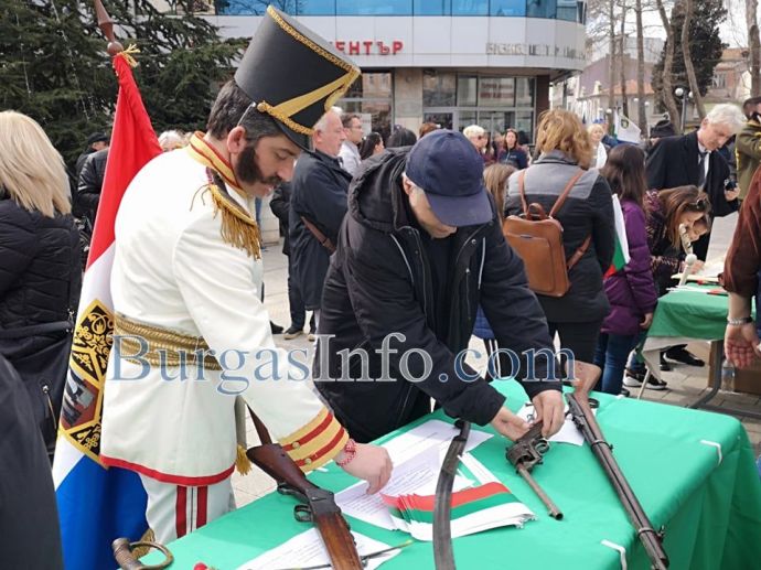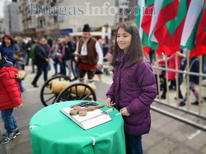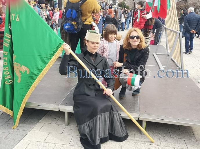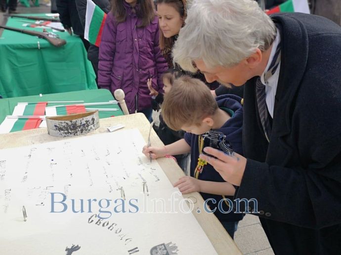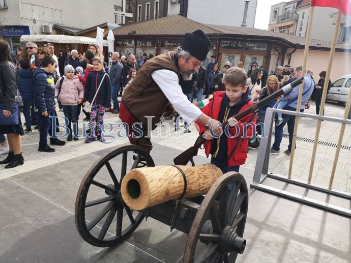 На площада истинска атракция са актьорите, които пресъздават образи от годините на Руско-турската освободителна война, както и оръжията, предоставени от бургаския музей. Стотици написаха с перо „Честит празник” и истински съпреживяват тържествената атмосфера.