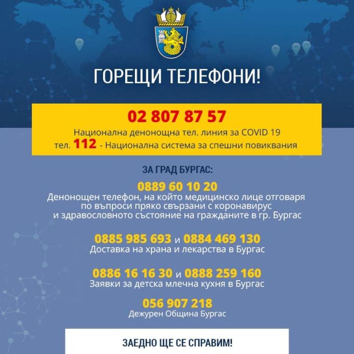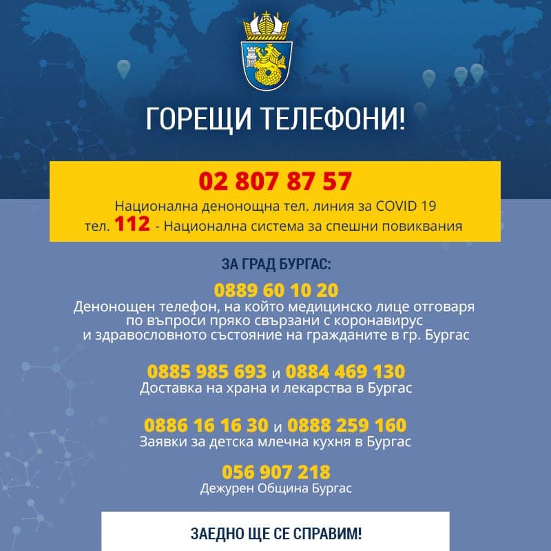 * ЕТО ИЗБРОЕНИ НА ЕДНО МЯСТО ВСИЧКИ ПОЛЕЗНИ НОВИ ТЕЛЕФОННИ НОМЕРА, НА КОИТО ЖИТЕЛИТЕ НА ОБЩИНА БУРГАС МОГАТ ДА ПОТЪРСЯТ ИНФОРМАЦИЯ И ПОМОЩ В УСЛОВИЯТА НА ИЗВЪНРЕДНО ПОЛОЖЕНИЕ: