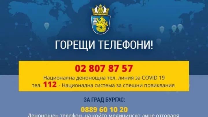 Денонощен Call център към Община Бургас, в който медицинско лице ще отговаря на въпроси, пряко свързани с мерките срещу разпространение на коронавирус и здравословното състояние на гражданите: ☎️0889 60 10 20.