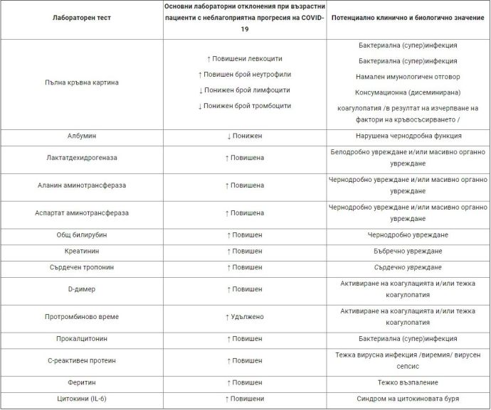 Световният опит показва, че пълната кръвна картина може да служи като евтин и много добър ориентир за състоянието на пациенти с такава инфекция, дори се разработват и валидират модели за определяне на тежестта и прогнозата на заболяването по промените, които настъпват в кръвната картина / Li Tan, Qi Wang/. Сериозни доказателства са натрупани вече, че намаленият брой на лимфоцити е лош прогностичен белег за развитието на това заболяване, както и за тежестта на заболяването и дори има предложения този критерий да бъде включен в диагностичните и терапевтични указания за COVID-19. Другите промени в кръвната картина могат да са висок брой левкоцити, увеличен брой неутрофилни гранулоцити, което говори за насложена бактериална инфекция, намален брой тромбоцити, който е в отговор на нарушения в хемостазата. Инфекцията с коронавирус засяга почти всички органи, особено при тежко протичане, затова е от полза да се проследяват показатели, които насочват към сериозни възпалителни промени. CRP се повишава значително както при бактериална инфекция, така и при тежка вирусна инфекция, усложнена с бактериално наслагване. Феритинът е белтък, който отразява запасите на организма от желязо, но също така той е остро-фазов белтък, който се повишава при остри възпаления като повишението е в рамките на 1-2 дни от началото на острия процес, а пикът е между 3-5 ден. Проследявайки нивата на Д-димер, се получава информация за засилено тромбообразуване в организма, което е факт при всяко възпаление.