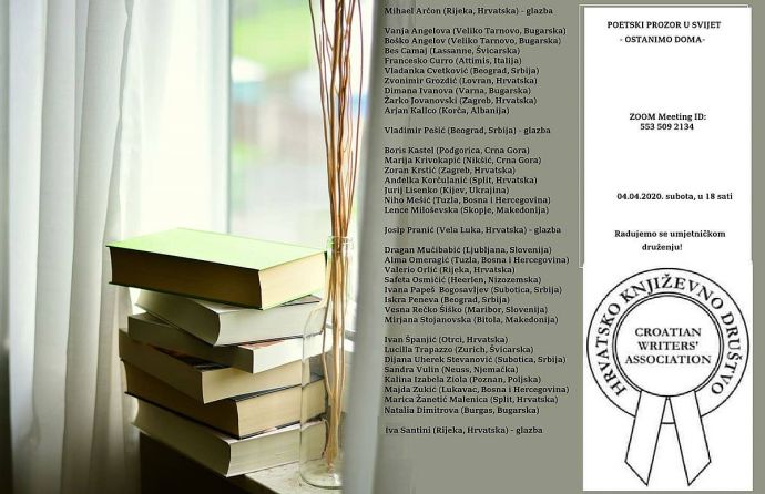 Четирима български автори бяха включени в престижната международна проява „Поетичен прозорец към света”, организиран от известния хърватски поет Валерио Орлич. В литературното онлайн-четене под мотото „Остани вкъщи!” се включиха 40 автори от няколко държави – Хърватия, Швейцария, Италия, България, Сърбия, Черна гора, Македония, Албания, Украйна, Босна и Херцеговина, Словения, Германия и Полша. Всеки от тях отправи своето послание в условията на новите реалности, които поставиха пред изпитание целия свят. Във времето, когато физическата самоизолация се трансформира в творчество с фокус върху красотата на мирозданието и общочовешките ценности.![]()