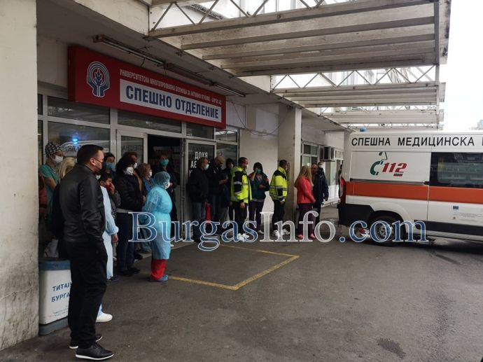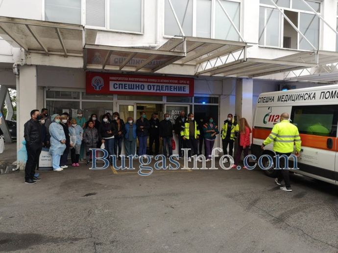 Медиците от УМБАЛ Бургас излязоха тази вечер в 19 ч. пред Шокова зала, за да изразят своята съпричастност към двете лекарки – д-р Илиана Иванова и д-р Нели Пандова, които загинаха в борбата с коронавируса. Те почетоха паметта на колежките си с минута мълчание и вой на сирените на линейките.