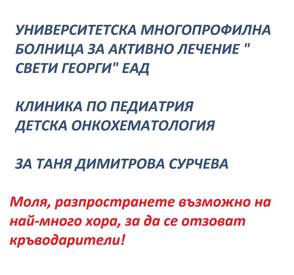 Моля, желаещите да помогнат на това прекрасно дете да дарят кръв”, пишат нейните близки.