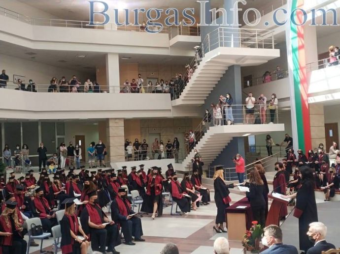 Над 100 абсолвенти от Бургаския свободен университет получиха своите дипломи днес, в навечерието на 24-ти май. Церемонията бе специална, тъй като тази година учебното заведение отблязва 30 години от своето създаване. Тя се проведе при необходимите мерки за безопасност. "Има мигове в живота на човека, които са незабравими, неповторими и единствени. Такъв миг е днешният – връчването на дипломите за висше образование в образователно-квалификационна степен бакалавър, магистър на нашите студенти. Вие заслужено получихте своите дипломи. Изключително се вълнувам, тъй като усещам Вашата сила и Вашата увереност и Ви давам част от своята огромна благодарност и тази на моите колеги – вашите преподаватели”, обърна се към абсолвентите ректорът на БСУ проф. Галя Христозова.