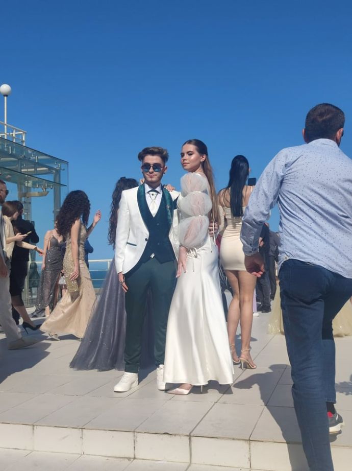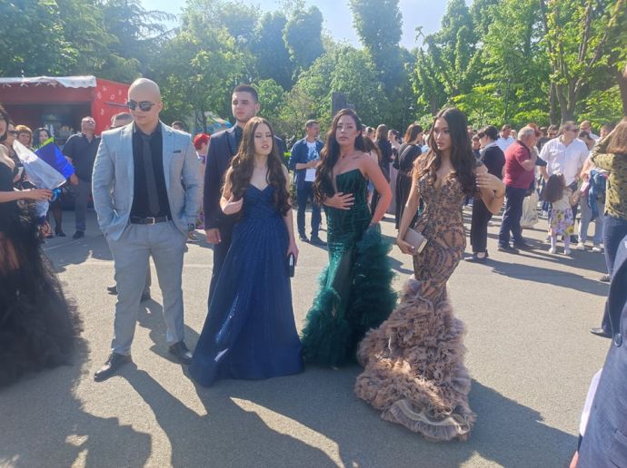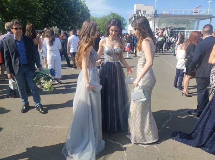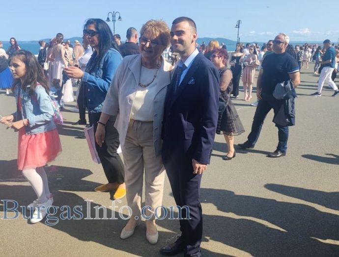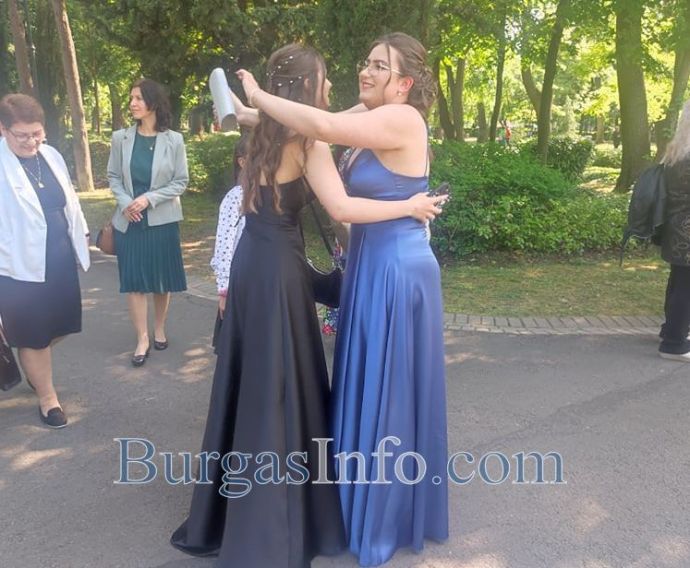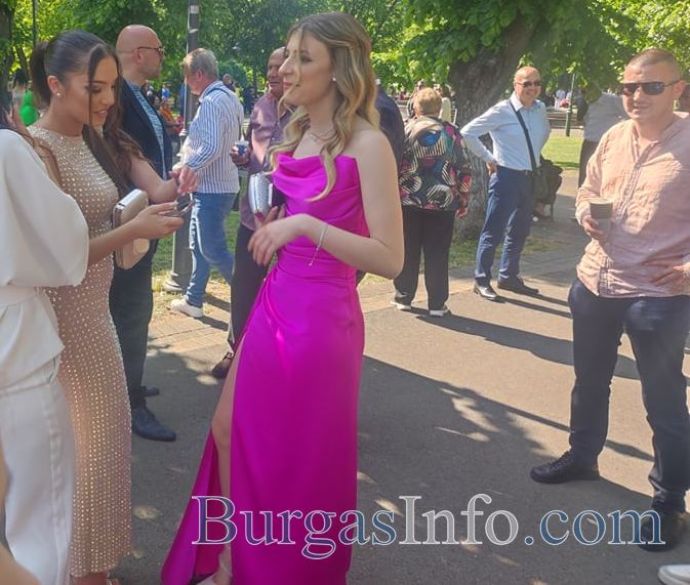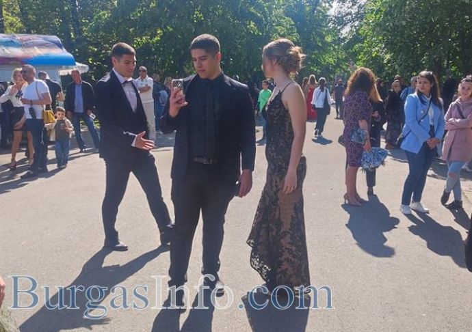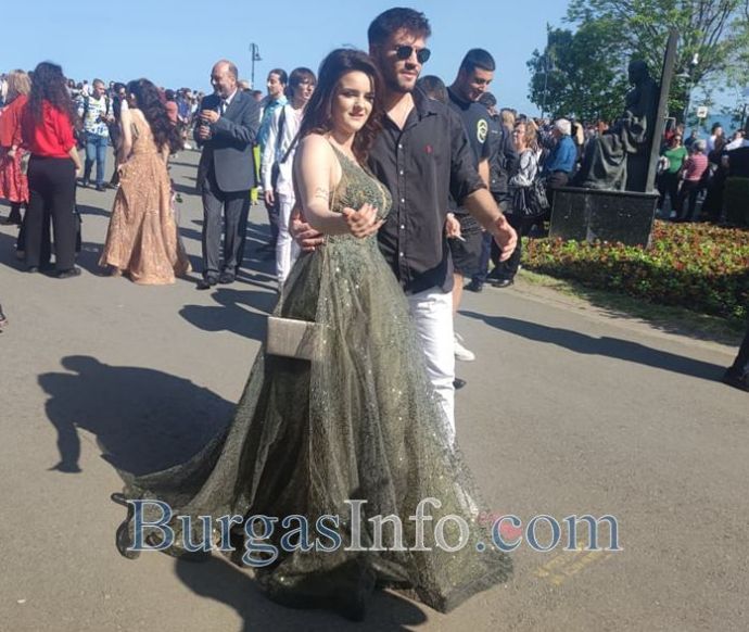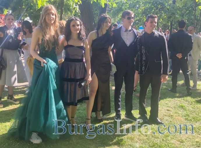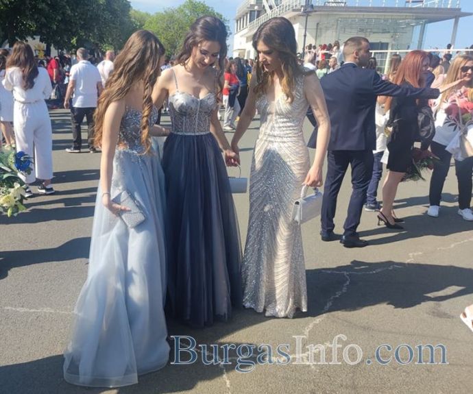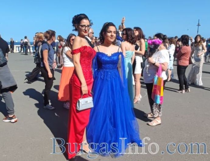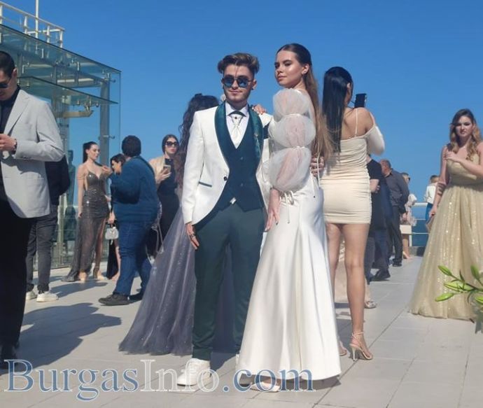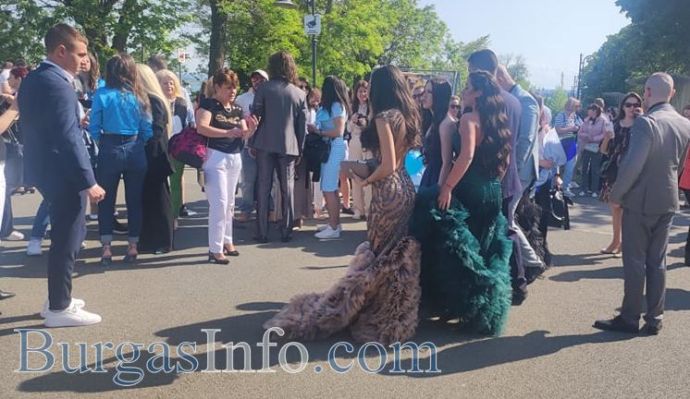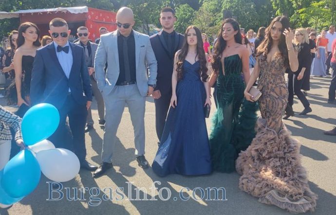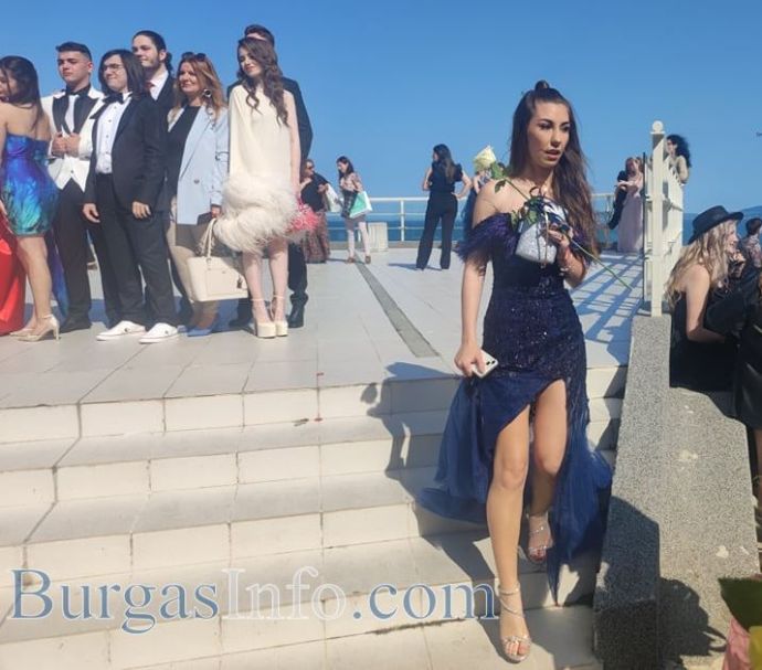 Абитуриентите от ГАЕ "Гео Милев" Бургас първи се съсбраха тази вечер край Морското казино, за да отпразнуват завършването на средното си образование. Сред тоалетите на дамите се забелязваше разнообразие от цветове и дължини. изобилстваха дантелата, камъните и пайетите. От терасата на Казиното зазвуча познатото и чакано от много гимназисти "Едно, две, три ... дванадесет". Много настроение, цветя и усмивки заляха района, където близките на младежите ги изпращаха към Слънчев бряг. Сред тях бе и кучето Майло, който видимо с умиление подаваше лапа на своята дама - Кристина.![]()
