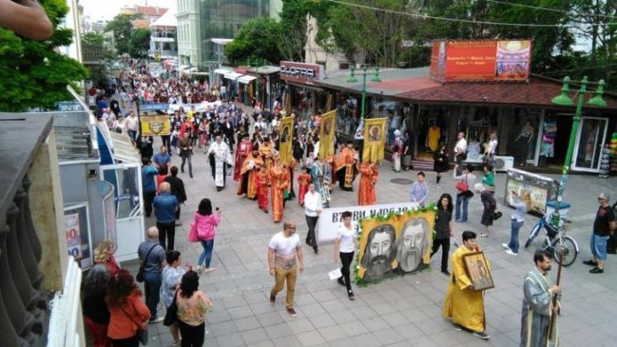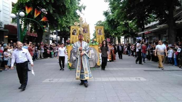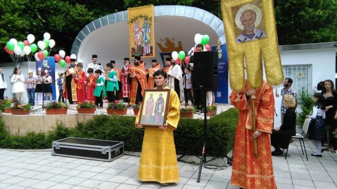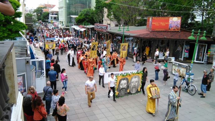 По традиция представители на бургаското духовенство носят иконата на светите братя Кирил и Методий.