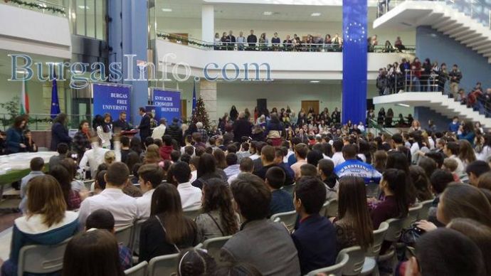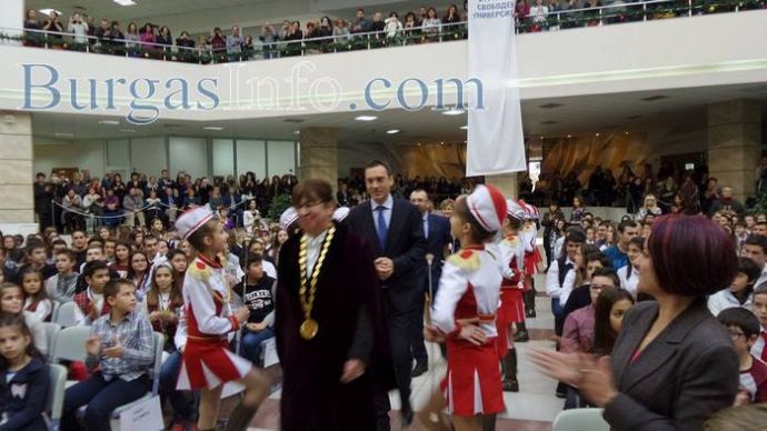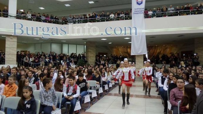 Гордост и усмивки изпълни днес Атриума на Бургаския свободен университет, където на внушителна церемония бяха наградени децата – отличници, които донесоха слава за Бургас на престижни национални и международни състезания (СПИСЪК С ИМЕНАТА ИМ - ВИЖ ТУК). 365 ученици и отбори заслужиха признанието със своите постижения през изминалата година. На церемонията по връчване на отличията им в навечерието на празника на града – Никулден, присъстваха кметът Димитър Николов, областния управител Вълчо Чолаков, зам. кметът по образование Йорданка Ананиева, началникът на Регионално управление по образование Виолета Илиева, ректорът на БСУ проф. Галя Христозова, много родители, преподаватели и приятели.