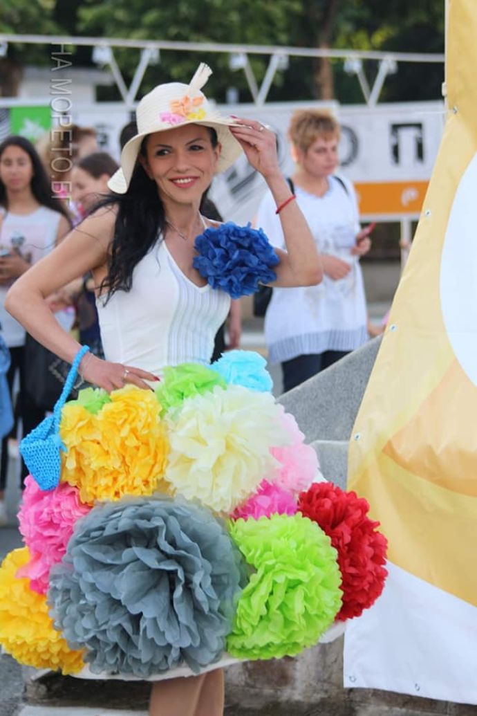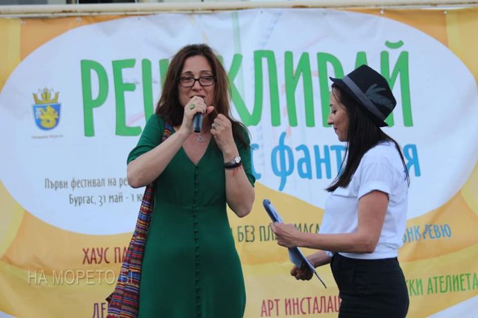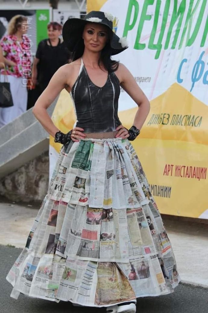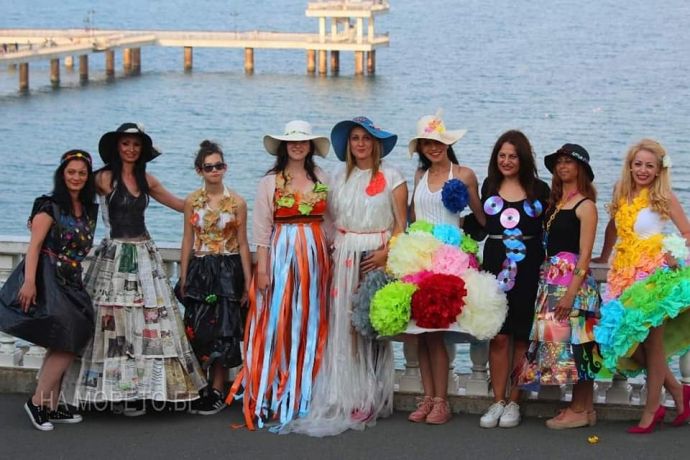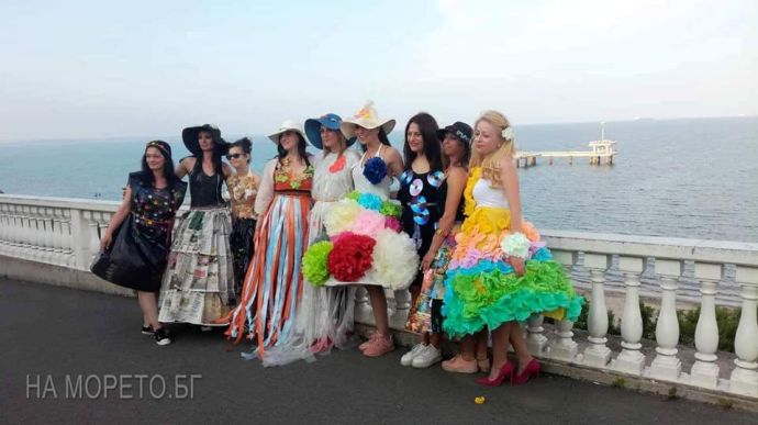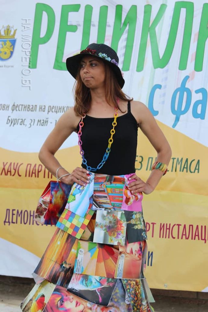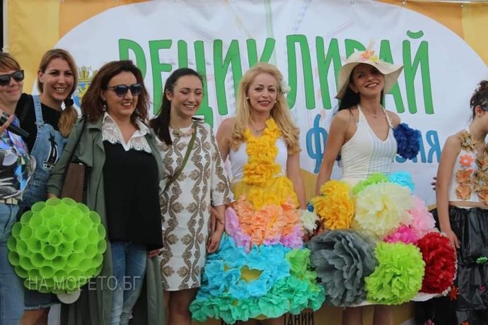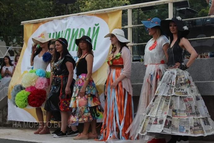 Бургаски журалисти и известни лица от подиумите и сцената дефилираха в атрактивно и цветно модно ревю в Морската градина. Те показаха как една дама може да се чувства перфектно в рокля, направена от хартия, найлон, капачки, пластмасови чашки и други материали, които вместо да замърсяват околната среда, могат да послужат за нещо красиво и цветно. Женя Петкова и Мануела Янева от сайта Gtamofona.com, Лора Стаматис от bTV, Боряна Тенчева и Надежда Гендова от нашия сайт БургасИНФО бяха журналистите, които приветстваха идеята за рециклиране с фантазия и влязоха в ролята на манекени като дефилираха на терасата на Морското казино пред събралите се край морето бургазлии и гости на града. Роклите, освен екстравагантни, са и заредени с много настроение, а и са удобни и практични – всеки възникнал дефект може да бъде лесно поправен с телбод или кламер от бюрото в офиса, вместо да се търсят шевни машини, ножици, конци и други сложни материали.