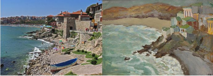 Можете ли да откриете деветте разлики между пейзажа и снимката днес? Вярно, малка по-застроено е в наше време. Любопитен факт е, че снимката е озаглавена „Античната южна крепостна стена в Созопол”. А на картината крепостта липсва. Възможно ли е Балкански преди 69 години да не е забелязал древния артефакт в пейзажа? Ами, ако питате мен, напълно възможно – те, художниците, са пословично разсеяни хора…![]()