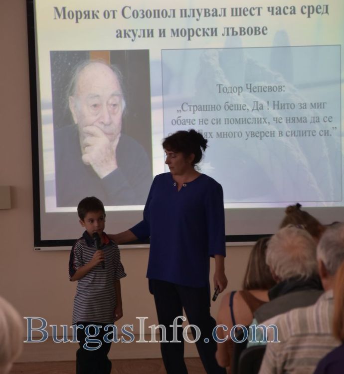 В ролята на разказвач се включи и нейния син Никола, който тази година ще бъде в I клас. Никола е останал много впечатлен от разказа, който му бил прочетен от майка му вместо приказка за "лека нощ" и сам изявил желание да го разкаже пред бургаската публика. В него герой е морякът Тодор Чепевов, който плувал 6 часа сред акули и морски лъвове, след като паднал от кораба. Смелият моряк обаче нито за миг не се изгубил воля за живот и бил спасен.