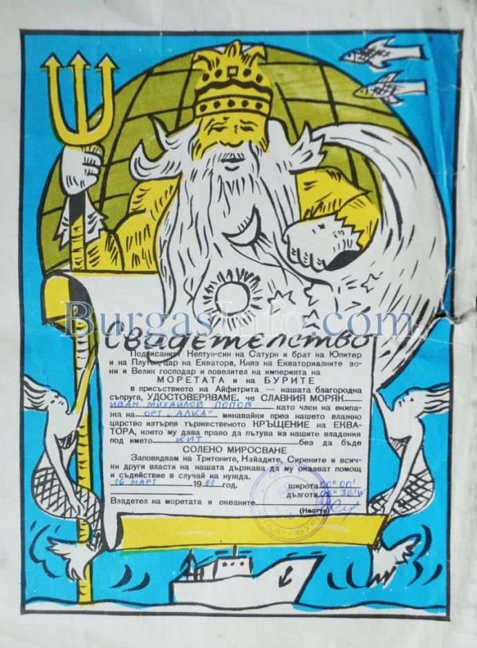 Само моряците, преминавали през Екватора, могат да кажат как се чувства човек, когато пресича най-дългия паралел на планетата. А само онези от тях, които са направили това на борда на български кораб, знаят какво е да си „кръстен” от Нептун по „нашенски”. Ритуалът е бил задължителен във времето, когато по света е плавала славната родна флотилия от „Океански риболов”. В какво се е състояла церемонията, изпълнението на която било традиция още за древните мореплаватели? Кои са били ключовите моменти в нея и какво значение е имала за екипажа, разказа бургазлията капитан Иван Попов. Той има зад гърба си 44 години плавателен стаж, като 23 от тях е бил на траулерите.