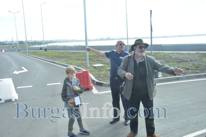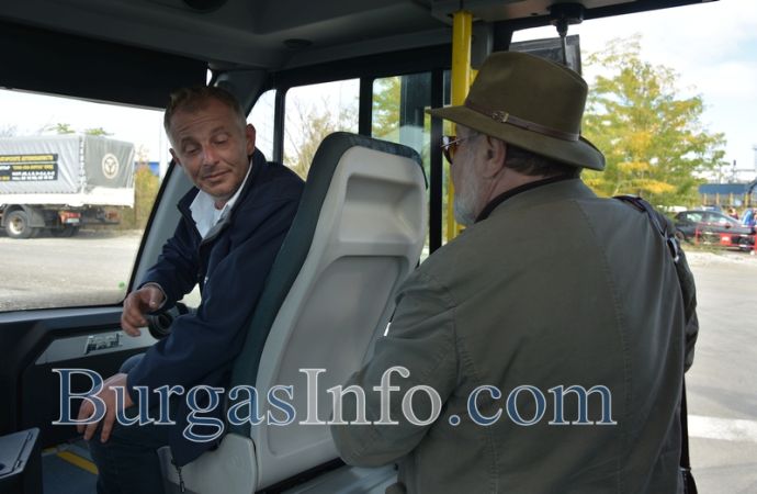 Заместник-кметът д-р Лорис Мануелян поздравява организатора Радко Петров в маршрутка на градския транспорт, която се движеше служебно по пистата.